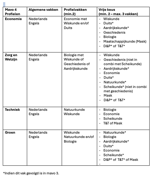 In periode 3 van mavo 3 wordt er door de leerlingen een definitief vakkenpakket voor mavo 4 gekozen. Hieronder de verschillende profielen en de bijbehorende vakken. De algemene vakken zijn voor alle leerlingen verplicht. Daarnaast worden er 2 profielvakken en minimaal 2 vrije vakken gekozen.